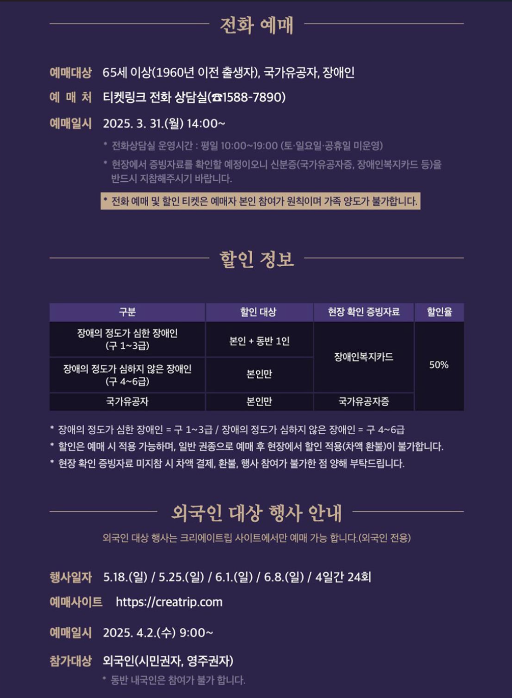 - 예매 오픈: 일반적으로 약 1~2개월 전, 인터파크 티켓에서 선착순 진행